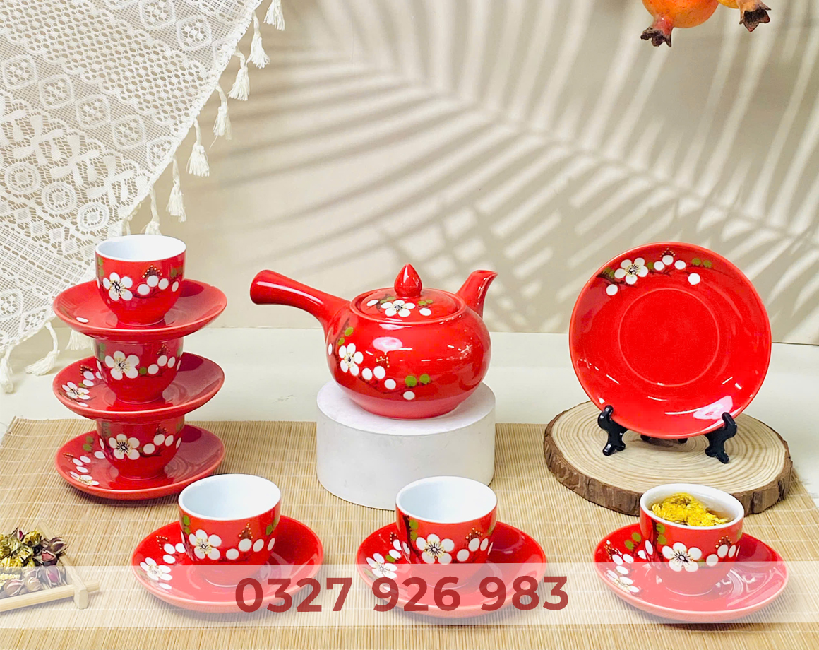 Bộ trà Như Ý men đỏ vẽ nổi hoa mận