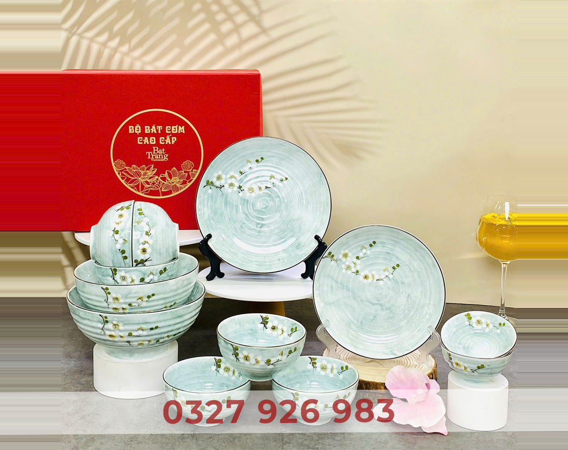Bộ đồ ăn Bát Tràng men xanh vẽ hoa đào