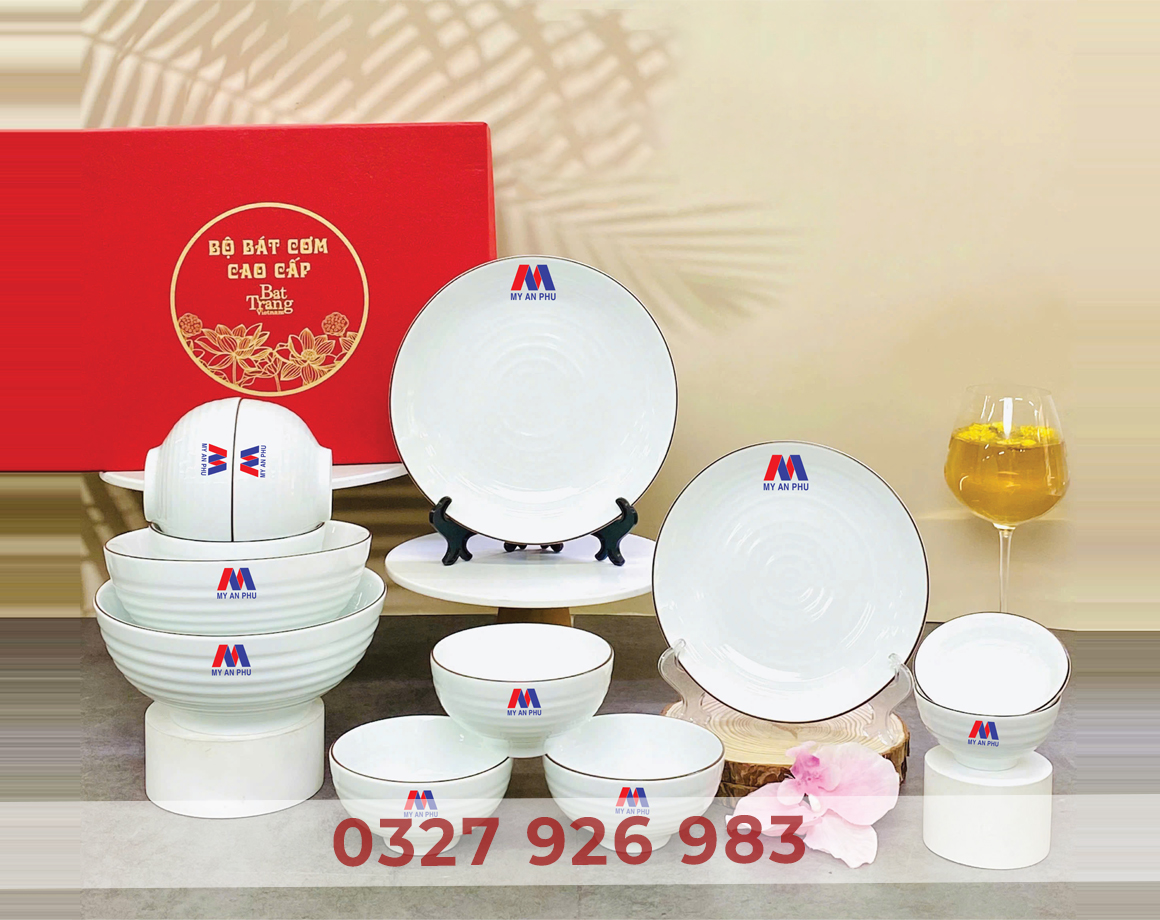 Bộ đồ ăn Bát Tràng kẻ chỉ xanh in logo May An Phu