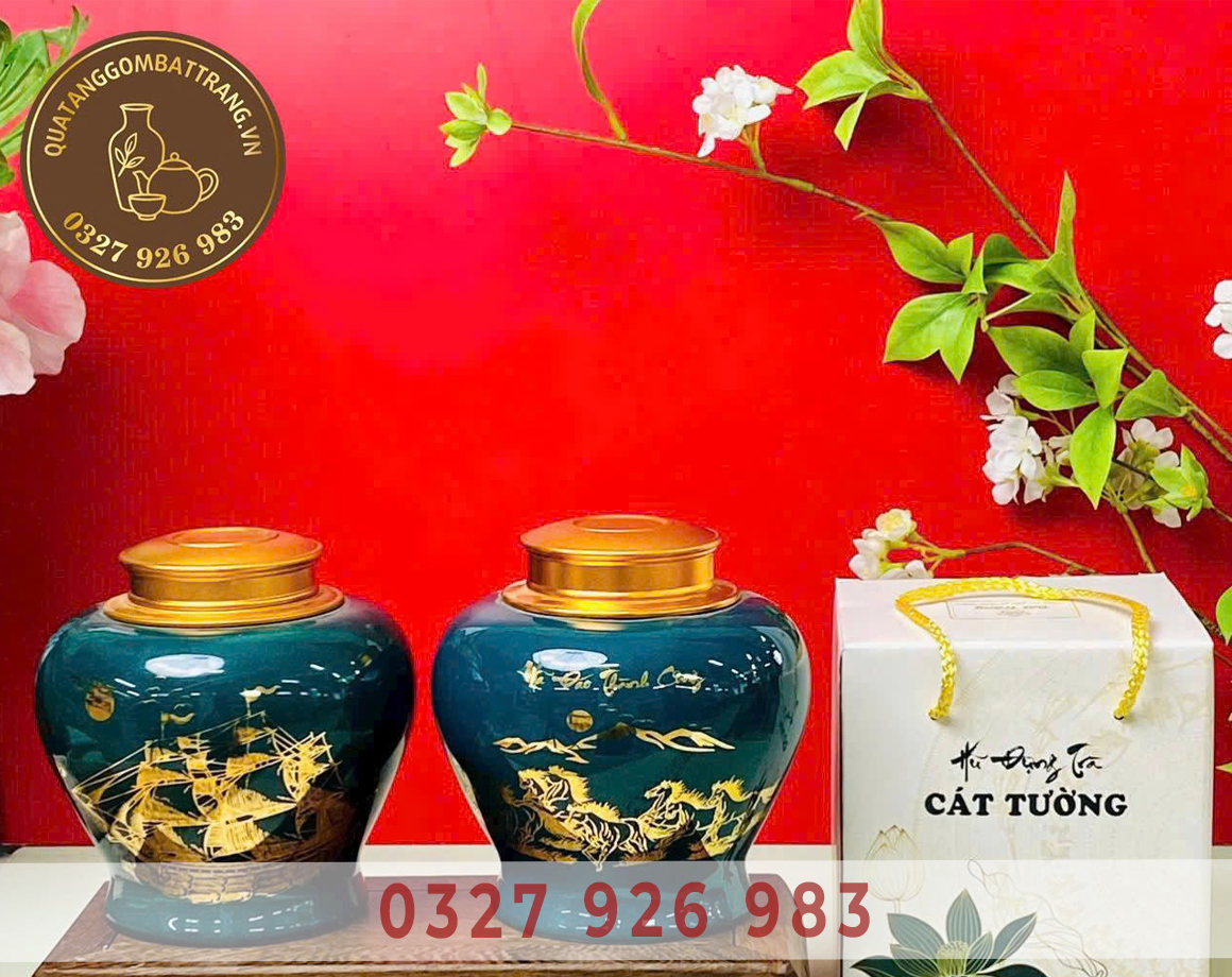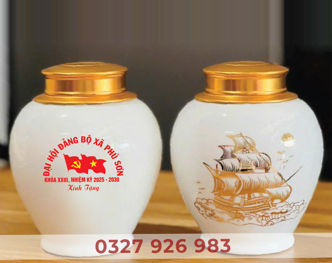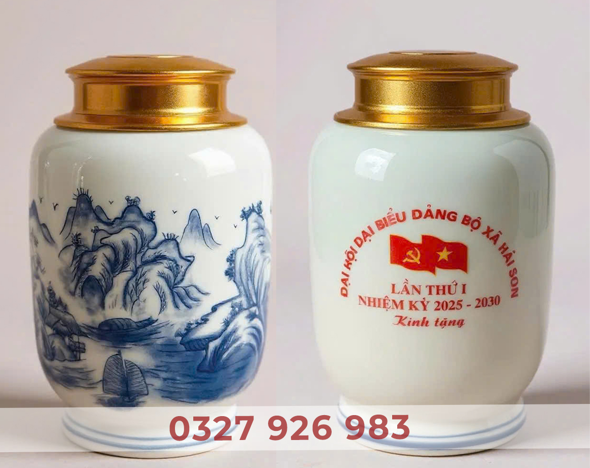 Lọ chè Bát Tràng vẽ sơn thủy in logo đại hội Đảng