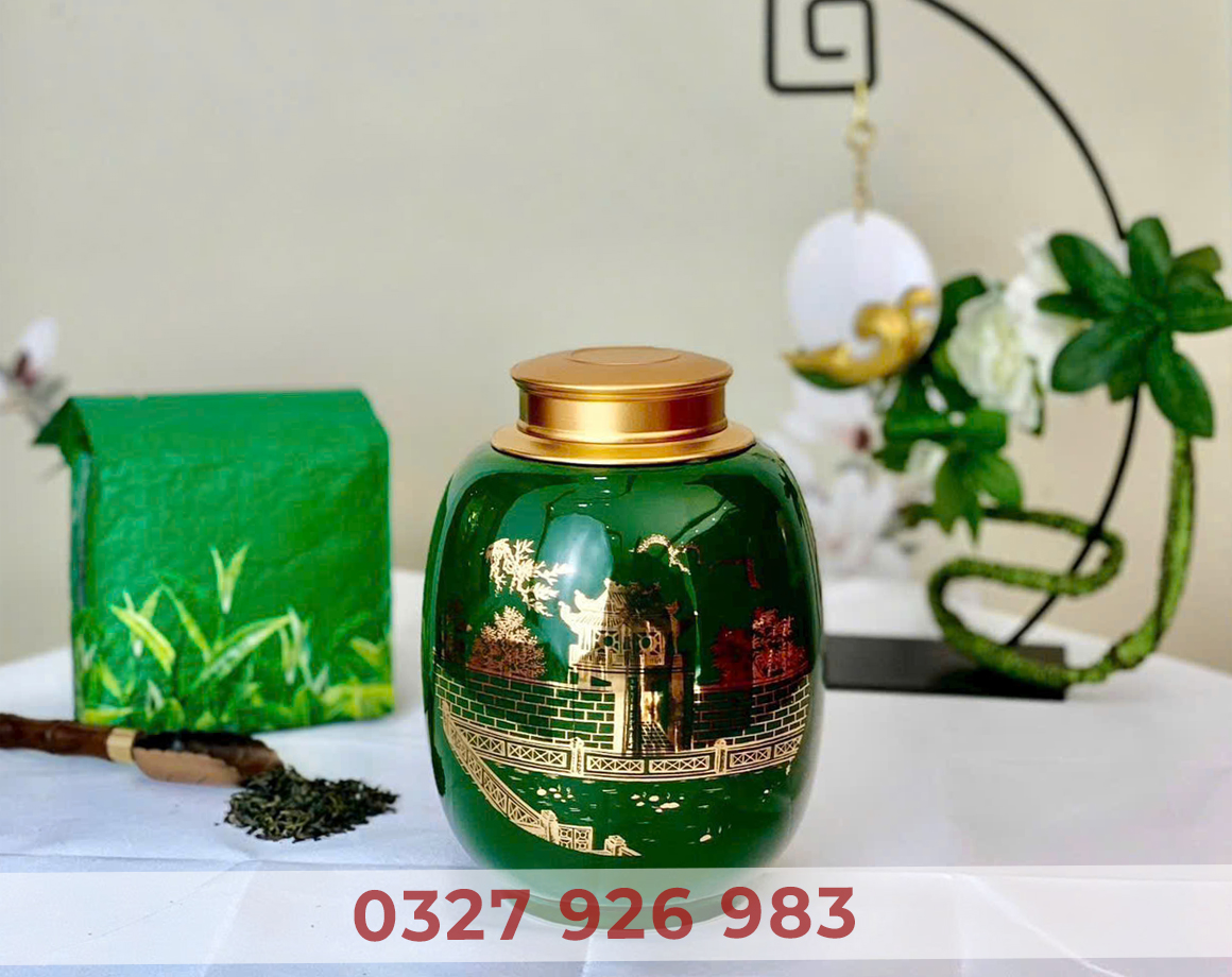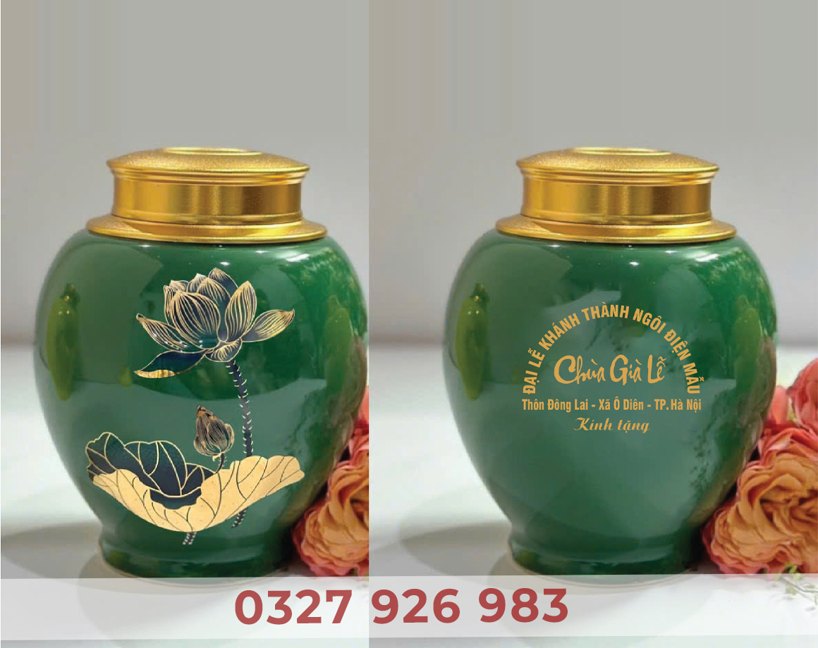 Lọ đựng trà Bát Tràng men xanh vẽ hoa sen vàng kim