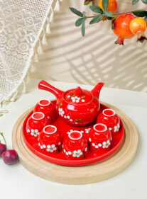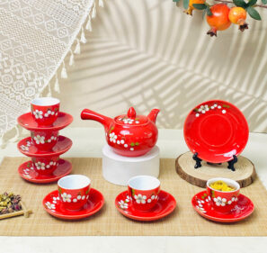 Bộ trà Như Ý men đỏ vẽ nổi hoa mận